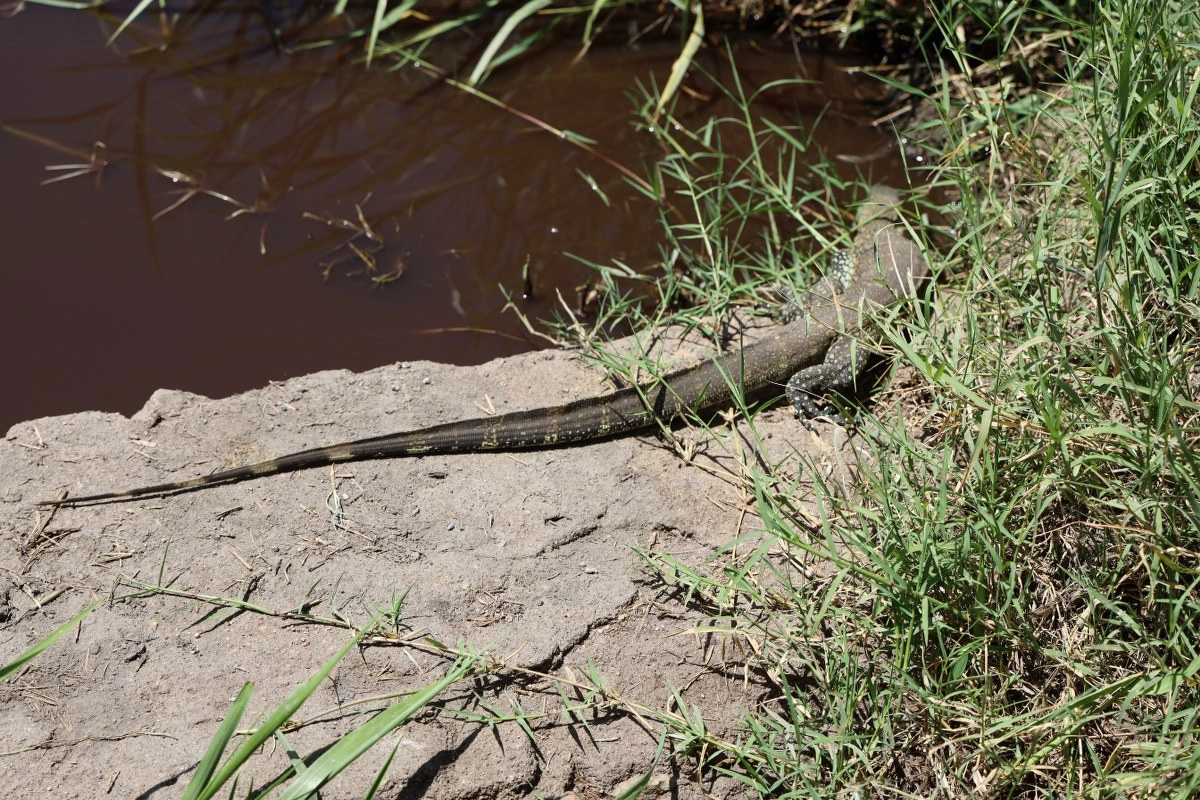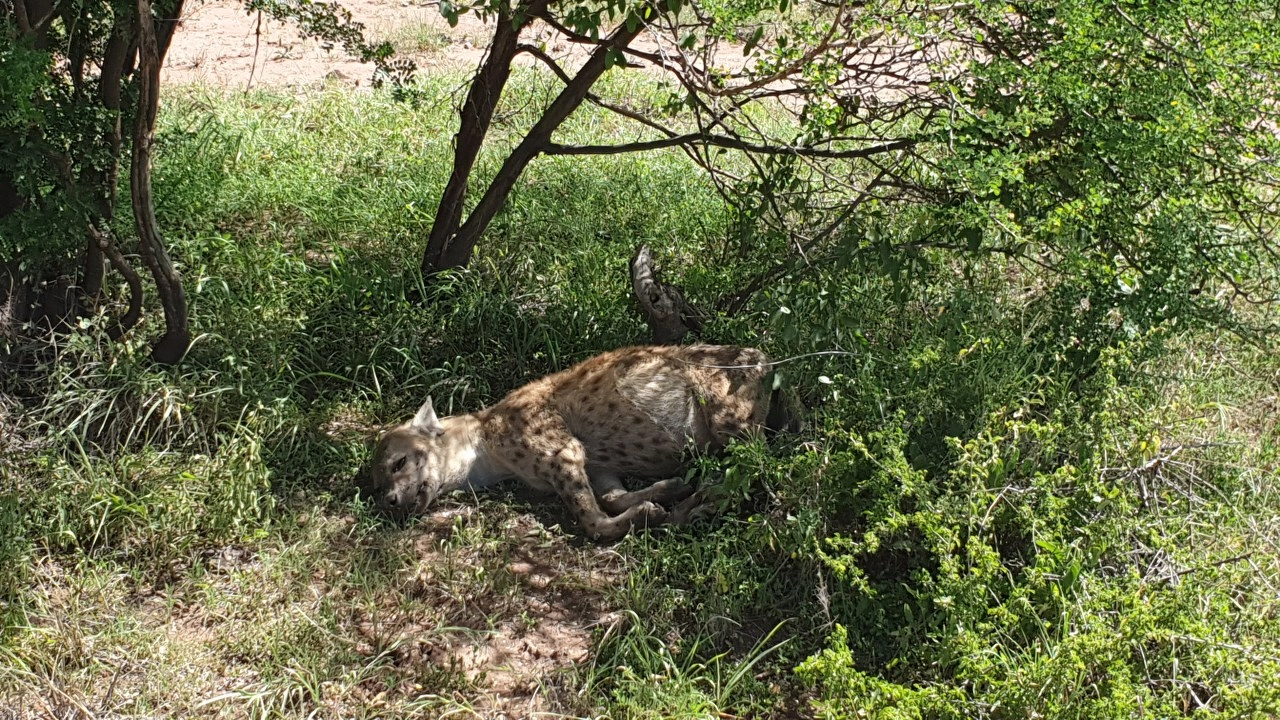 Pametniji za jučerašnji dan safarija, vežemo mi noge već na startu. Lijepe akacije koje na samome izlasku iz lodgea prolazimo nagovještavaju dobar dan. Kao da već nije dobro počeo? Tu prolazimo baru neobično crvene boje i uočavamo velikog monitor guštera te potpuno same hijene koja leži u sjeni grma. Čini nam se, na prvu, kao ona od sinoć, ali približivši se bliže, uočavamo da ova hijena nije dobro. Ne izgleda dobro, ne diše dobro, možda je nastradala, a možda je bolesna. Nemamo što, nažalost joj ne možemo niti ne znamo pomoći pa nastavljamo dalje. Iako takve stvari nije lako gledati, tako očito mora biti – zaključujemo i teška srca prihvaćamo proces prirodne selekcije.