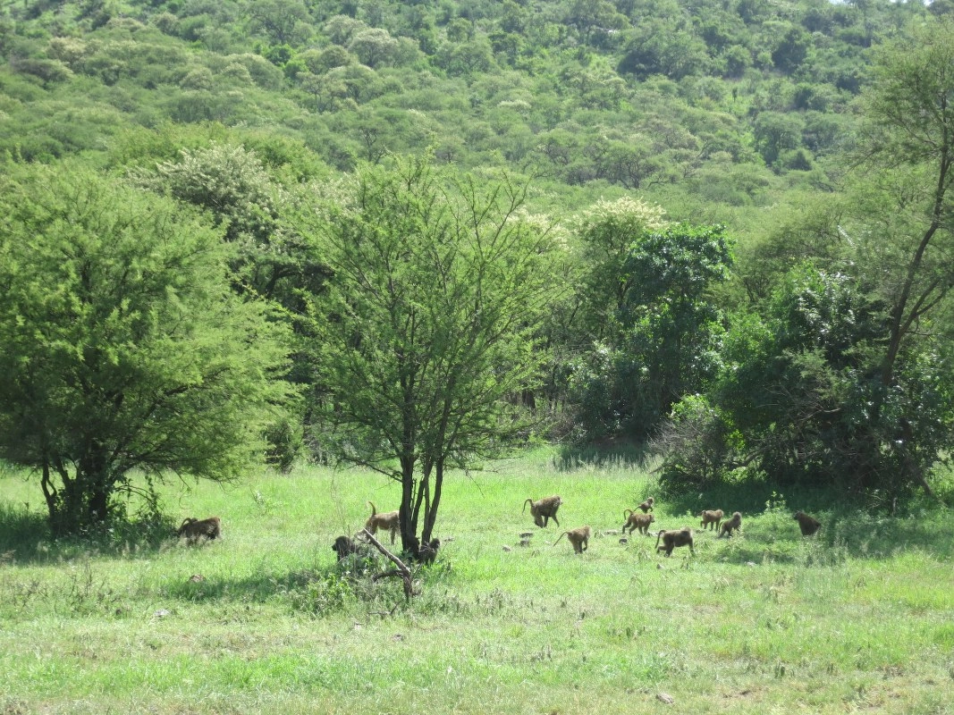Konačno nešto drukčije! Tri divlje svinje i poprilično veliki termitnjak! Muhe su ovdje živa napast, ali ne damo se smesti i ispustiti iz vidika tri hijene dobro sakrivene u visokoj travi. Ne znam što rade, ali djeluje ini kao da se igraju. Odmah preko puta „staze“ koncentraciju nam privlači glasna svađa i natjeravanje bande majmuna. Bome se fino mlate!