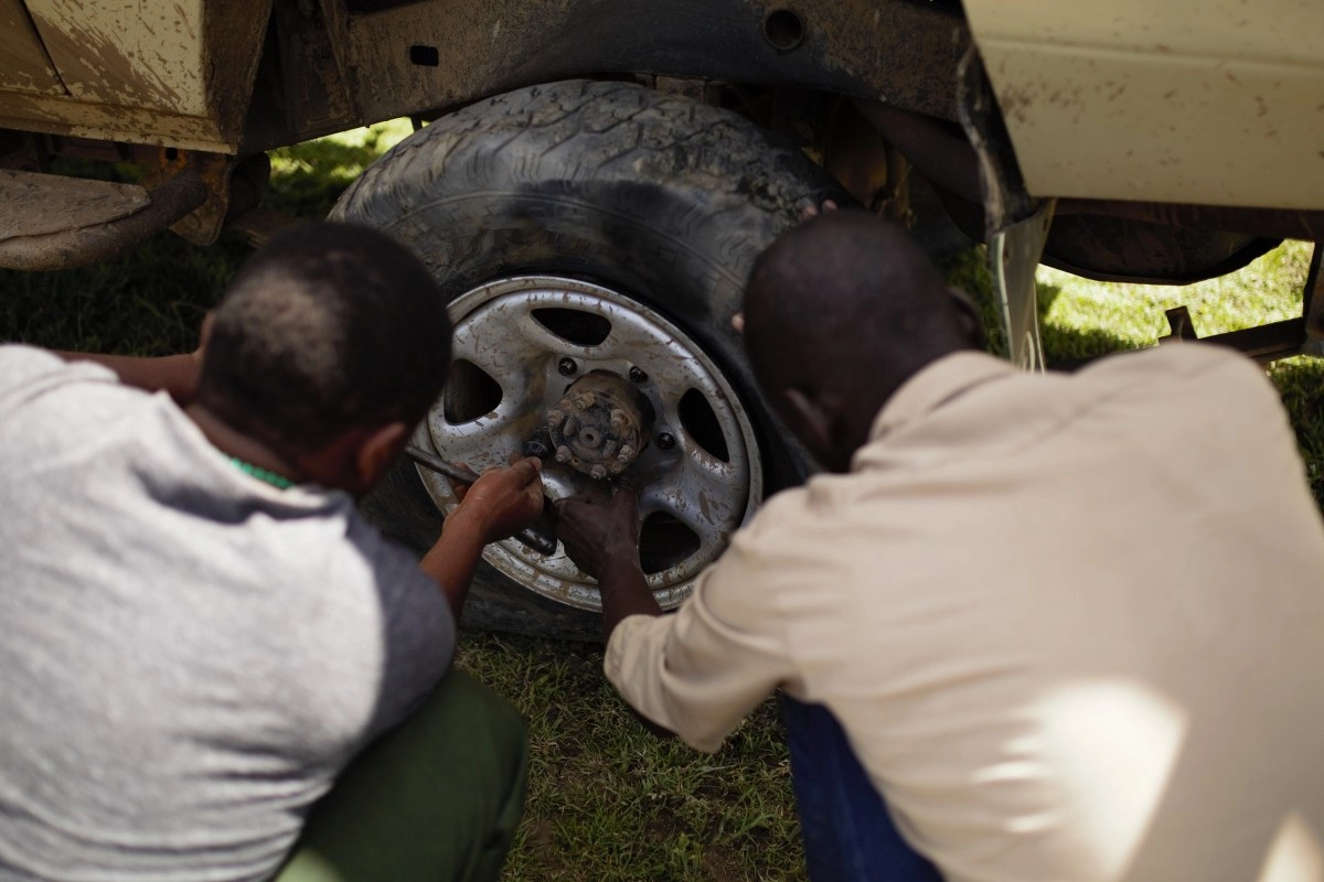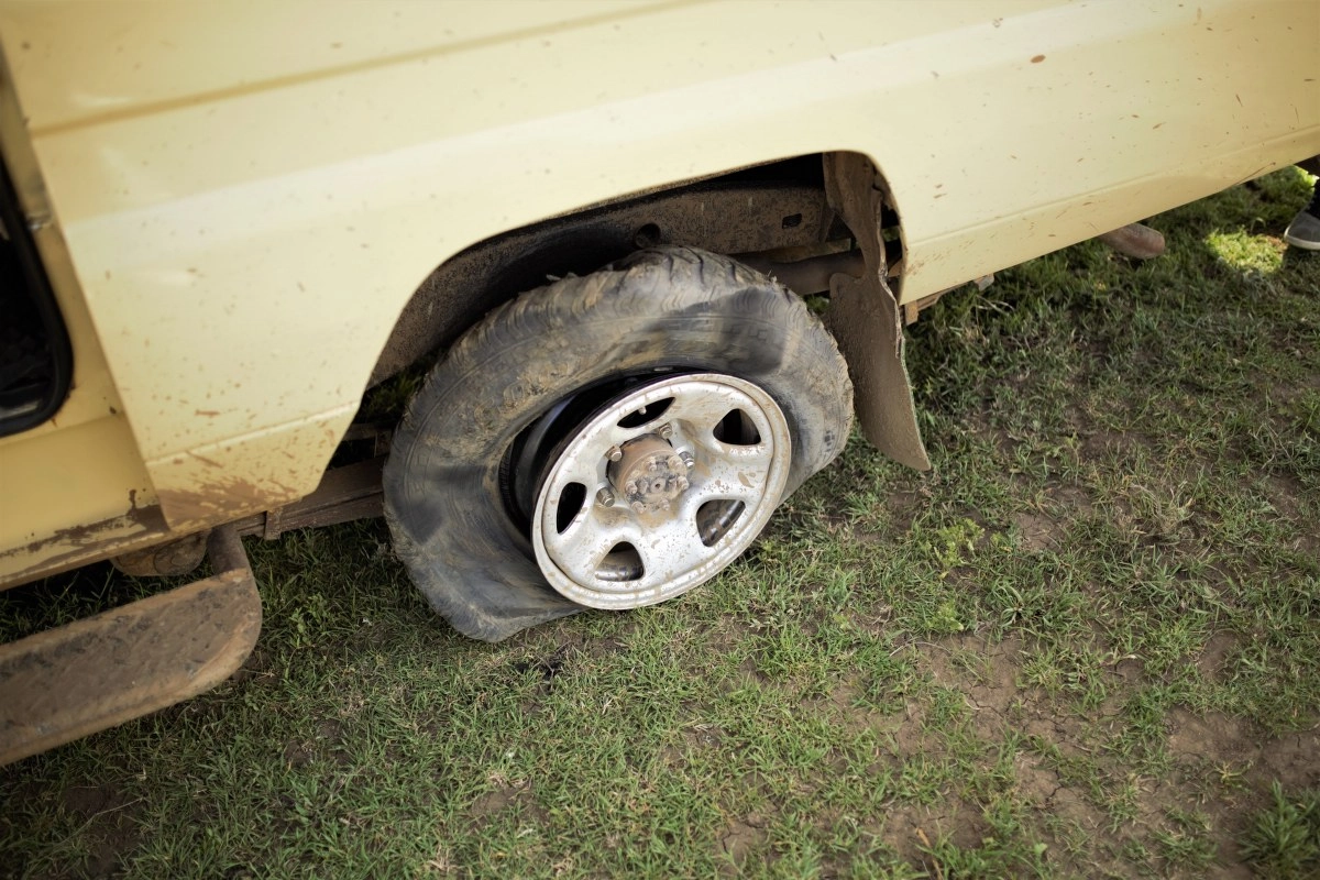 Obavivši mokrenje, nastavljamo dalje dalje makadamom. Svega par minuta kasnije džip se u vožnji čudno drma. Stajemo, a Thomas govori da nam je pukla guma! Je li moguće? I stvarno, guma nam izgleda kao da je implodirala i onda kao da ju je na to još netko sažvakao. Srećom, do nas ubrzo stiže džip s lokalcima i znatiželjnim licima te pitanjem da li trebamo pomoć? A, ne! Vade alat i bacaju se na posao. Mi, naravno, sve promatramo i čudimo se kao glupi turisti te čuvamo stražu ne bi li se na vidiku pojavila nekakva opasna životinja.