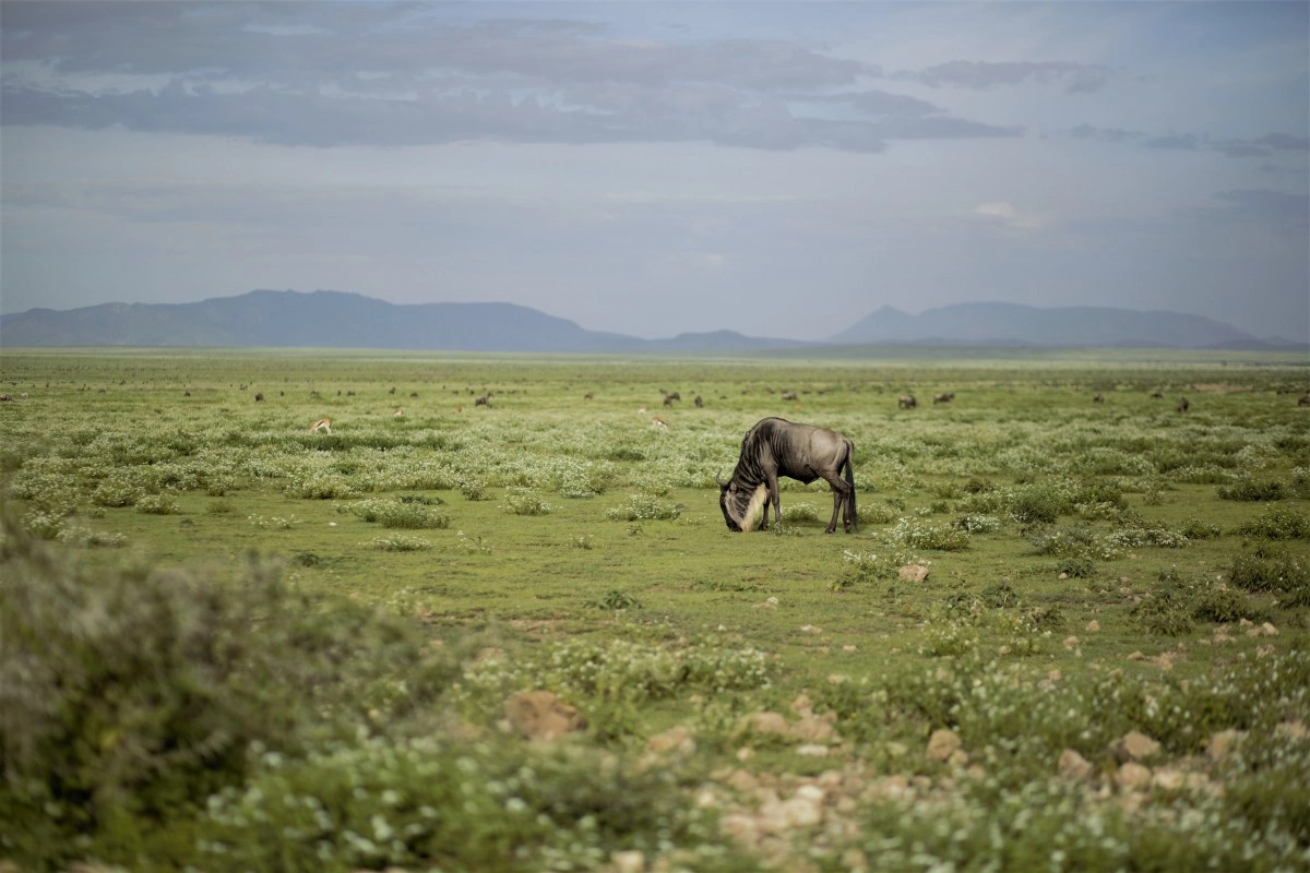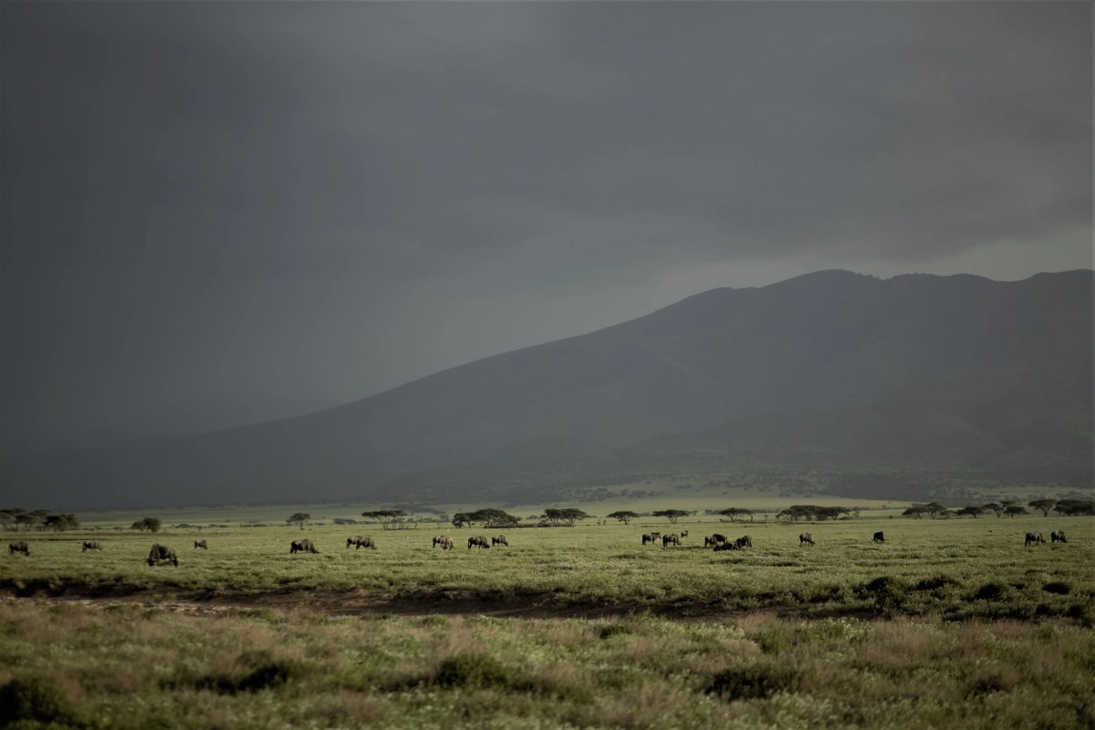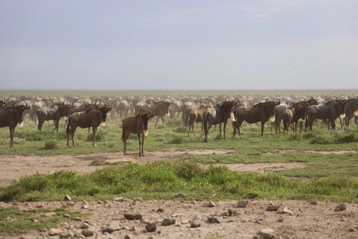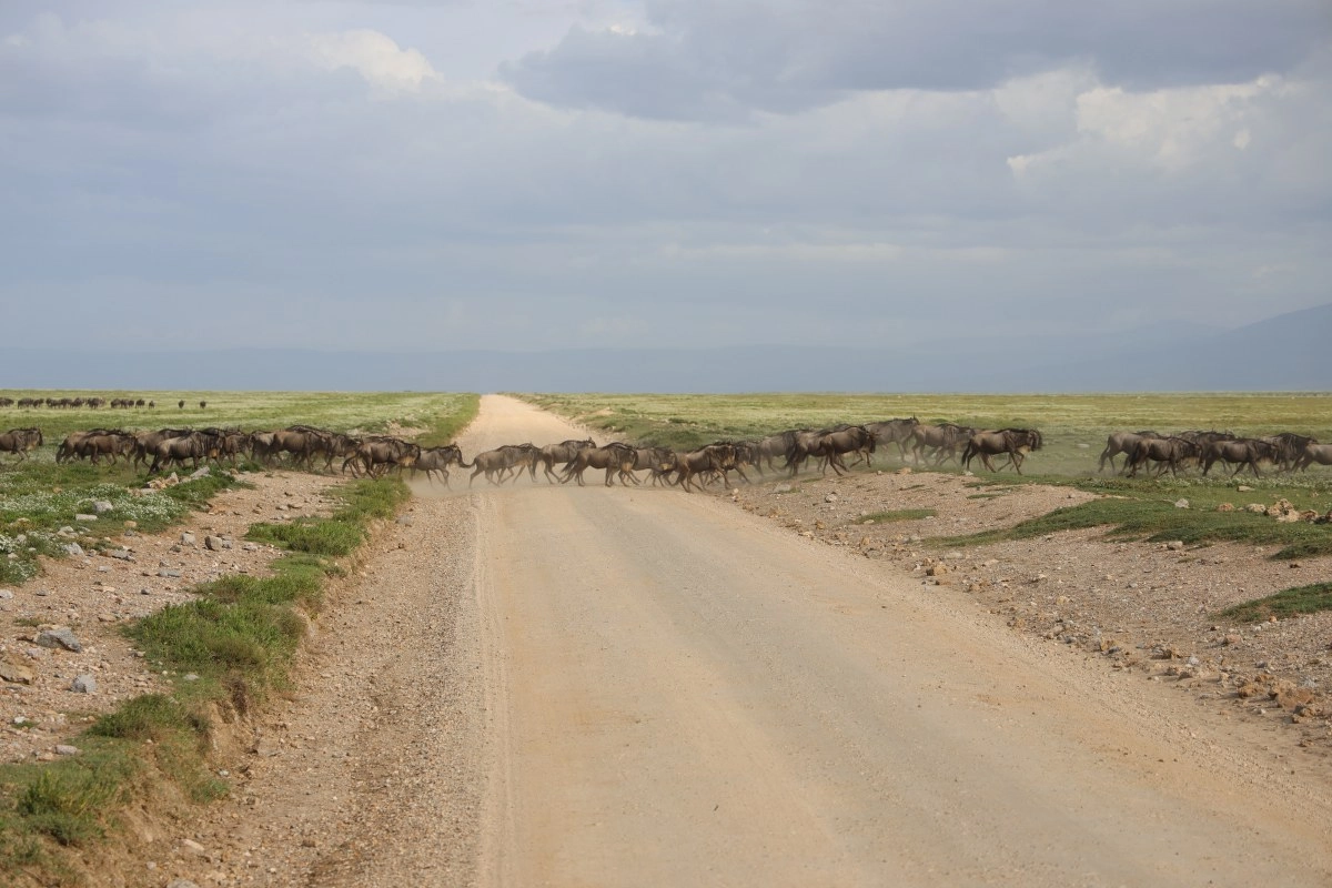 Sunce je skroz oslabilo i zašlo iza gustih sivih oblaka. Iako je i dalje užasno vruće i sparno, spašava nas zrak koji nam preko otvorenog krova dopire u unutrašnjost džipa. Na putu nas svako malo zaustavlja veliko krdo gnuova koji prelaze cestu. Kad god bi se našli u ovakvoj situaciji i prišli im dovoljno blizu, gnuovi bi prestali prelaziti cestu i nastavili bi trčati paralelno uz džip gledajući u nas posve zbunjeno, glasajući se slično kravama.