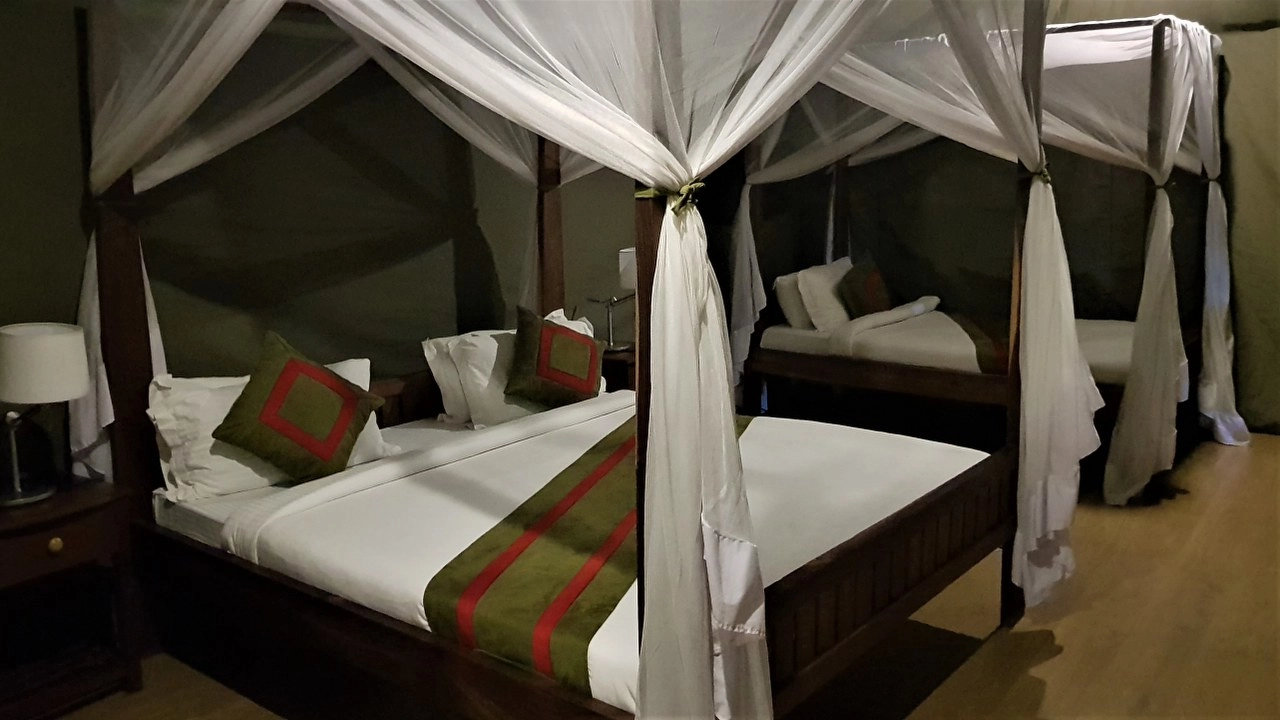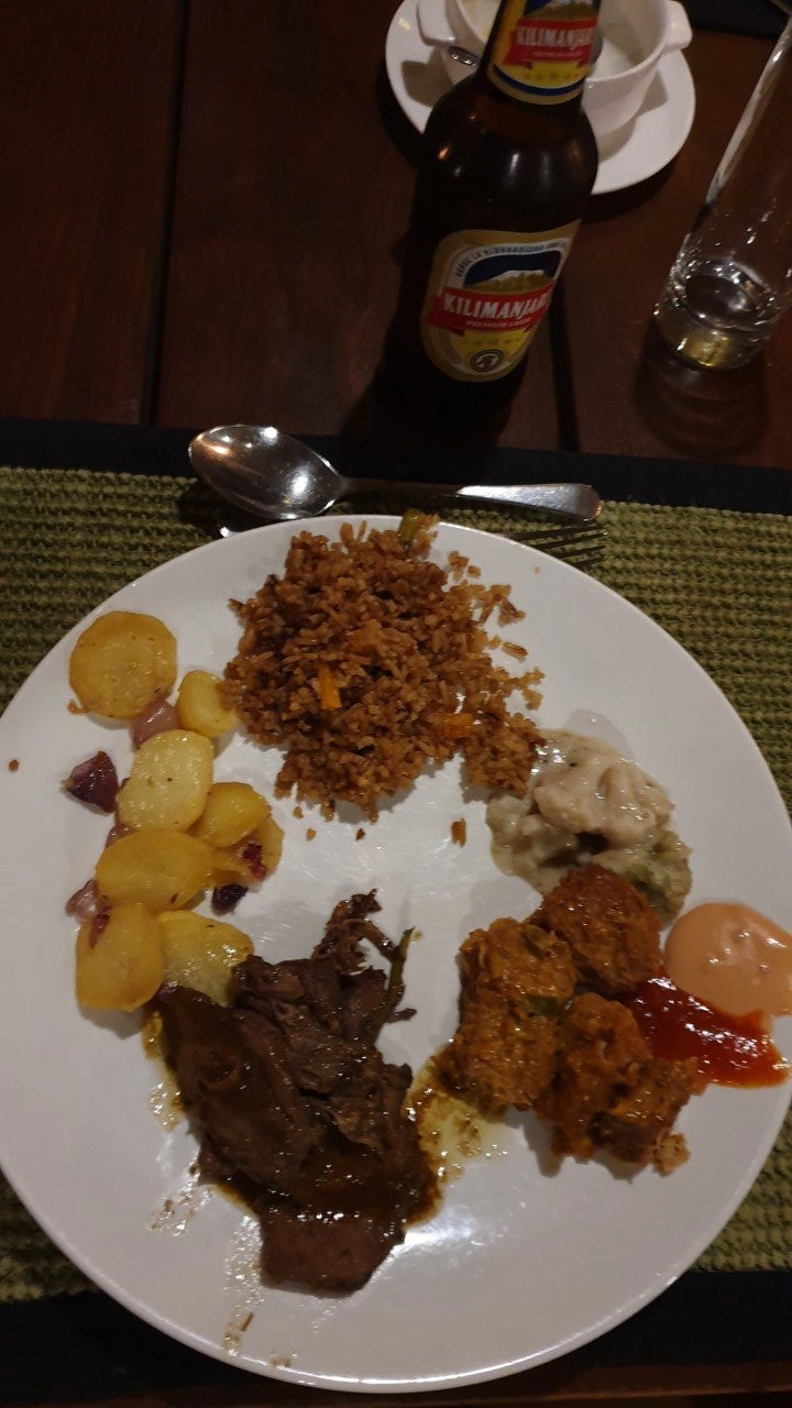 Nema ograde pa ne smijemo sami lutati okolo, a do šatora nas prati čuvar. Iako su trijem i pod napravljeni od čvrstih materijala, zidovi i strop ipak su samo jedan običan baldahin pa možemo reći da spavamo u „šatoru“. Ostavljamo stvari i u pratnji odmah odlazimo na večeru. Za večeru je pitaj Boga što, ali piva Kilimanjaro je tu!